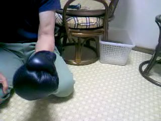 - グローブに手を填めて拳を握り感触を確かめる