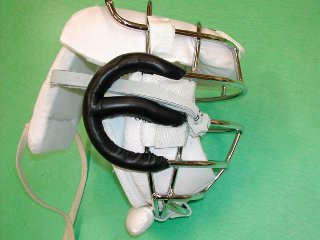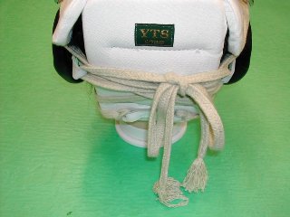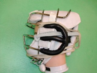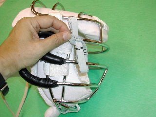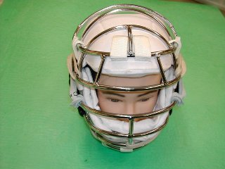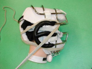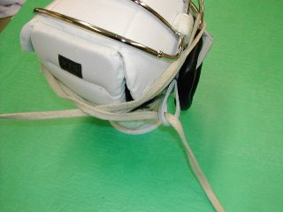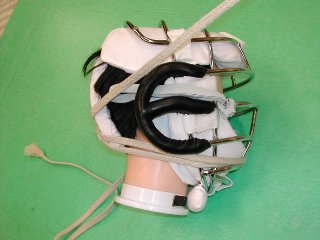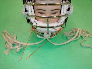 徳島大学拳法部で採用する面紐を使用した防具面の標準的な縛方法。
