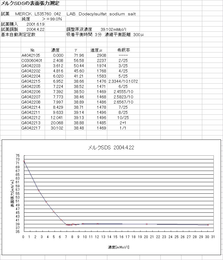 DVS2000システムによりメルク社SDSの表面張力測定からCMCを求めた。新開発した自動進度調節方式の表面張力測定ソフトにより自動測定した。低濃度域でも吸着平衡時間は3分程度で充分と判明している。