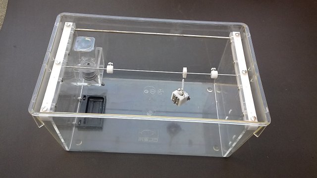 | 尾懸垂クリップの開発により尾懸垂試験は簡単で安定した測定になった。 数週間に渡る測定に使用する飼育ケージは適当なのが無かった。 市販ラットケージに納めるだけで測定可能とする滑動式架台を新たに開発した。 軽量マウス用ローラと組み合わせるとマウスのストレス軽減。 給水瓶と餌箱取り付け可能 ラット飼育用ケージを活用する事で測定装置検討が簡単になる 2015/01/05 |