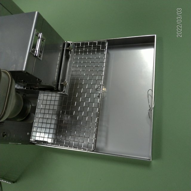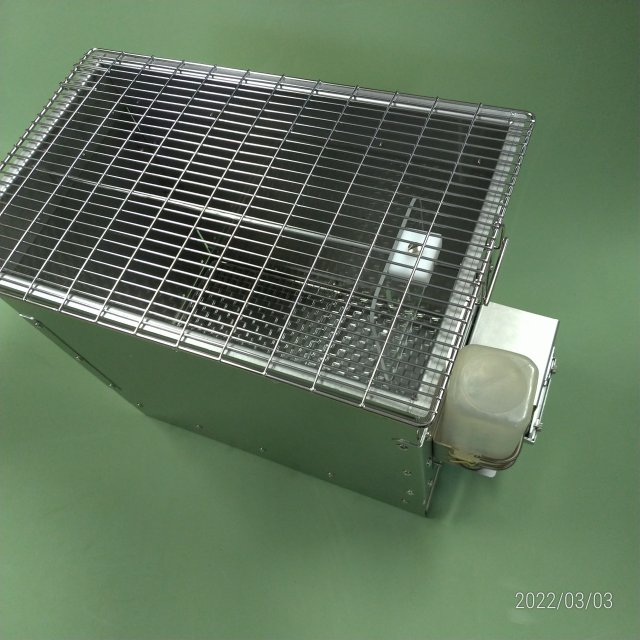 | ラット尾懸垂試験用の適当なケージは無く、ウサギ或いはモルモットケージを流用する場合が多かった。 オートクレーブ可能なケージも必要であり新たに専用ケージを開発した。 底部に簀の子と糞受けを個別に設置して実験中の保守管理が簡単にできる。 100〜500g以上の大型ラットまでの尾懸垂試験を目的として設計した。 重量 約9Kg 幅 27cm 高さ 40cm 糞受けトレイ付き 奥行き 43cm 餌箱台突起部は除く |
