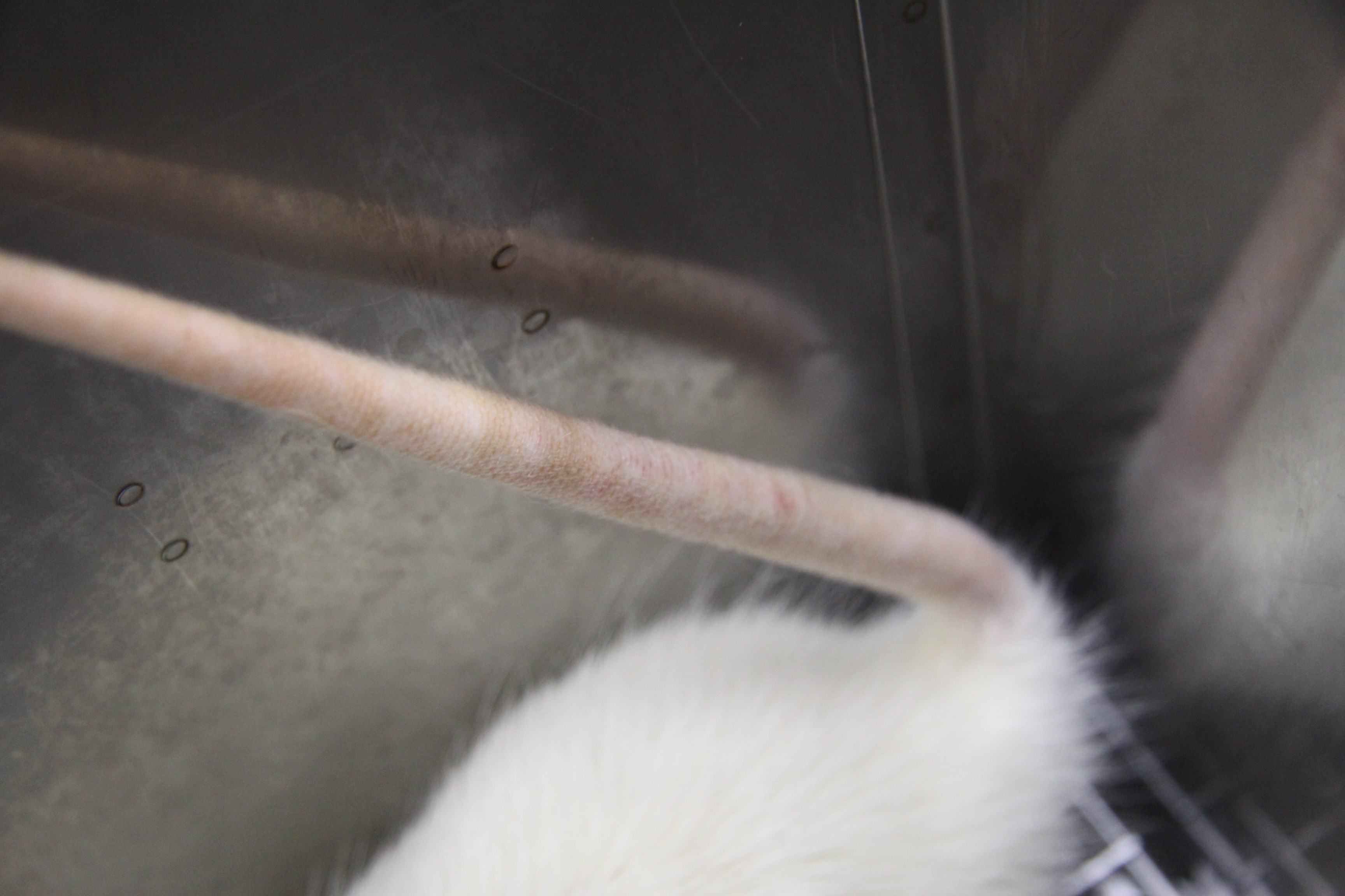 | 一週間尾懸垂試験した尾 従来は部分的に赤く発心した が通気性向上により軽減 |